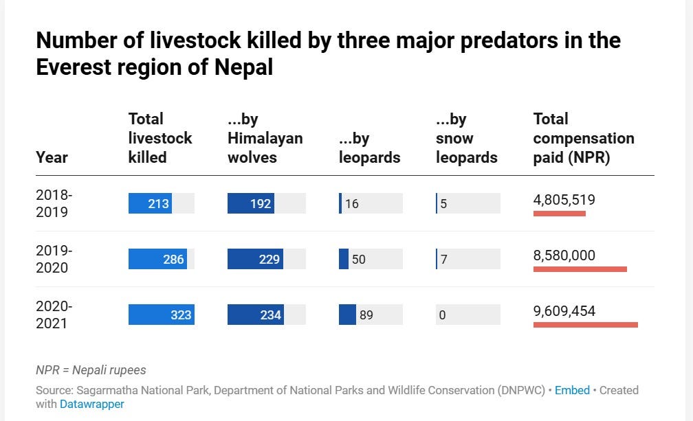 On a fine morning in April 2022, Mount Everest can be seen clearly from the Sagarmatha (Everest) National Park office in Namche, northeastern Nepal, the snow from its peak evaporating to form a thin layer of cloud. Bishnu Rokaya, the park’s assistant conservation officer, has little time for the beauty on display as he flips through the pages of their latest annual report. He points to a passage stating that, “from mid-2020 to mid-2021, over three hundred livestock [animals] were killed by wild animals in the park and its buffer zone areas, for which we have paid the communities a sum of over 9 million rupees [USD 85,000 USD] as compensation for their losses.”