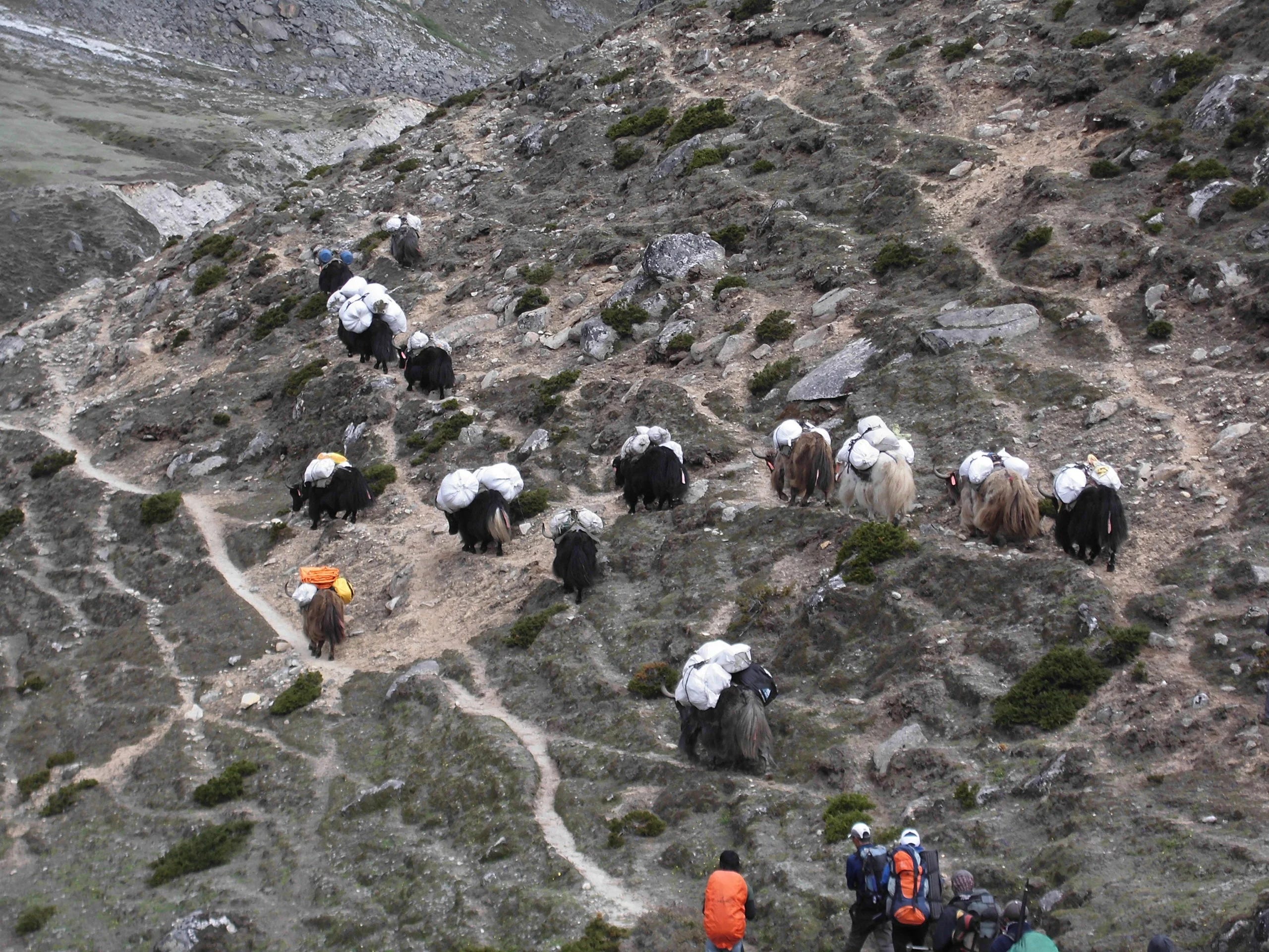 Yaks and porters en route to Tibet, on an expedition to bring yaks from Tibet to the Syangboche Yak Breeding Centre in Nepal in 2014 (Image: Lalan Yadav, Syangboche Yak Breeding Centre)