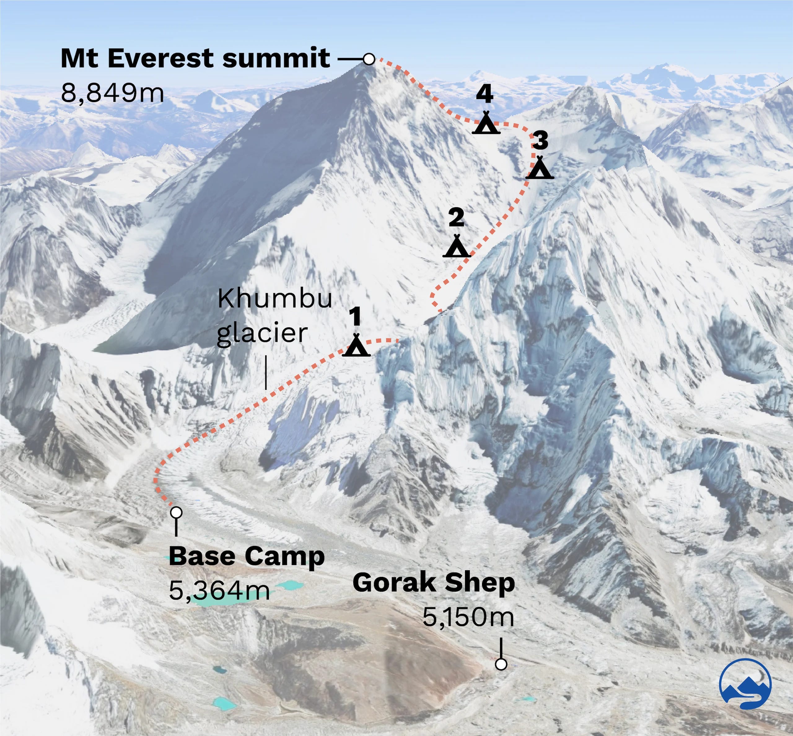 Base Camp and camps 1 to 4 on the Nepal route up Mount Everest • Graphic by The Third Pole • Imagery: Landsat/Copernicus via Google Earth